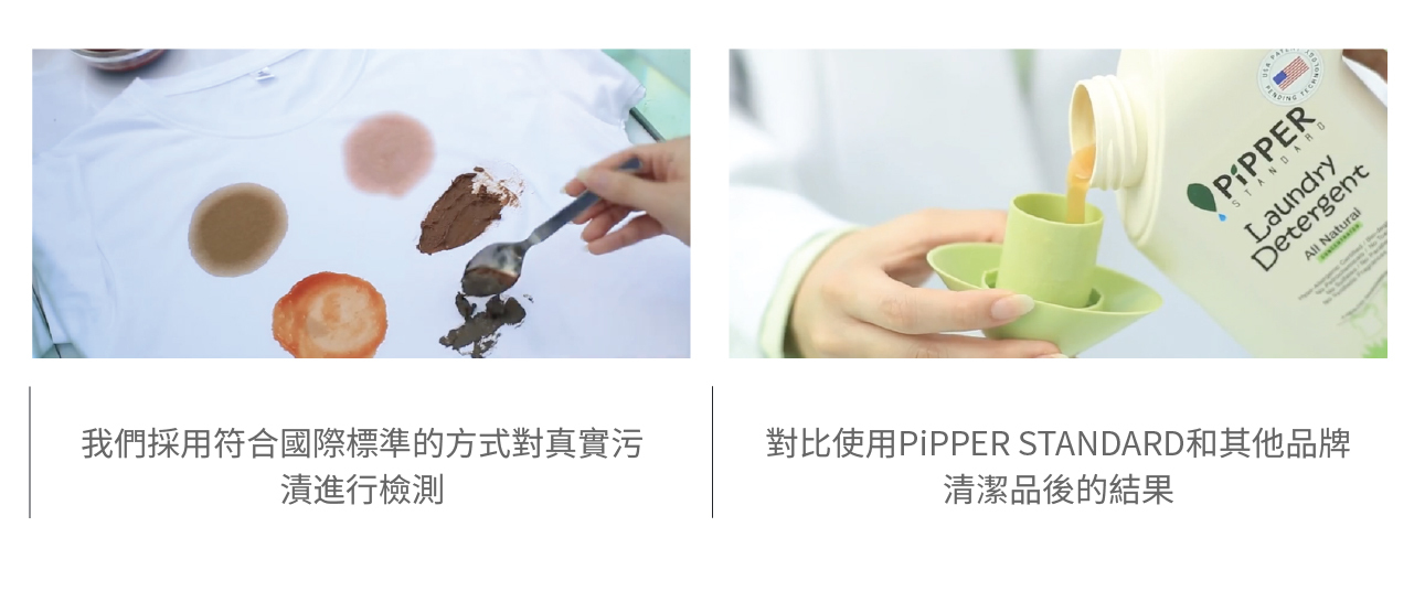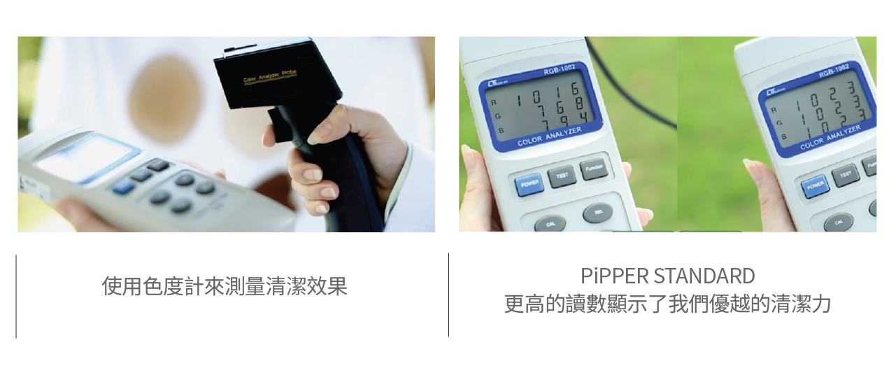 我們採用符合國際標準的方式,對真實污漬進行檢測,對比使用PiPPER STANDARD和其他品牌清潔品後的結果。