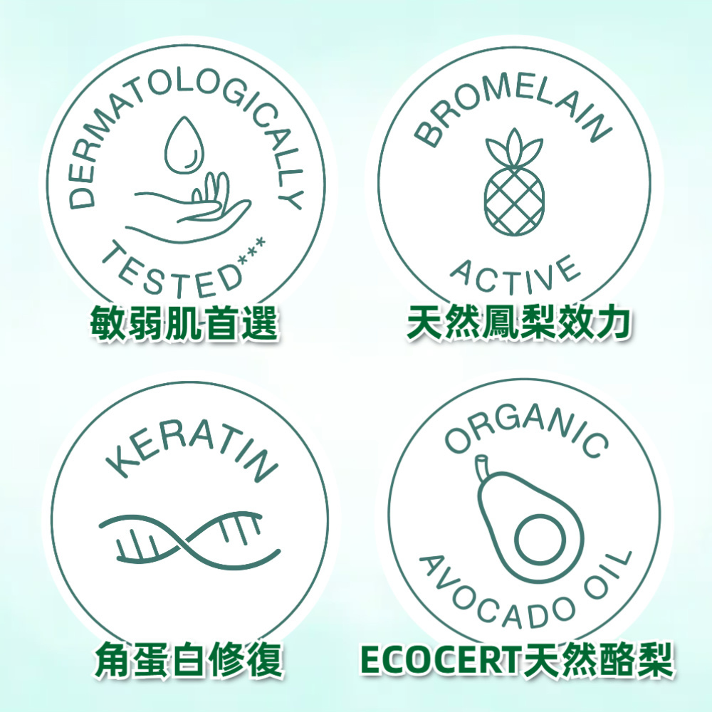 添加ECOCERT認證酪梨油,其角蛋白深度修復受損髮質。