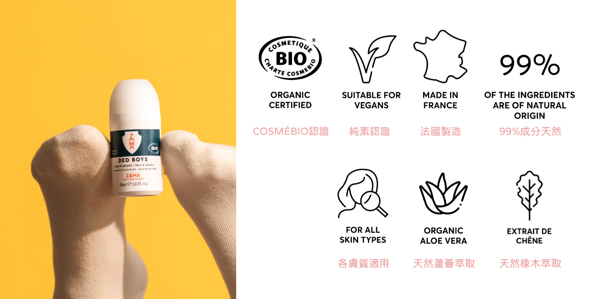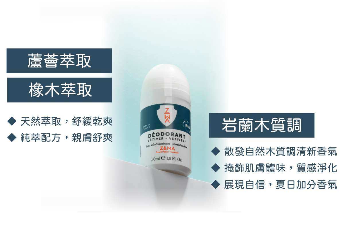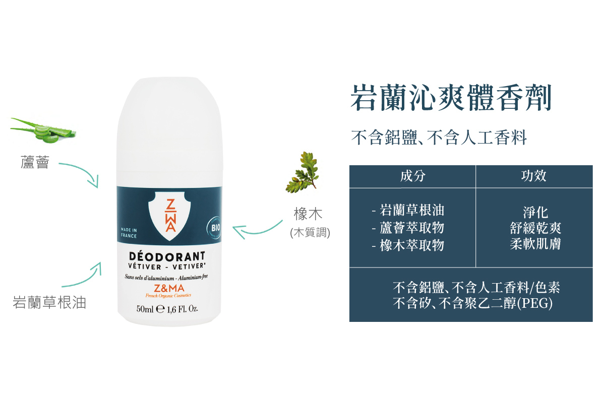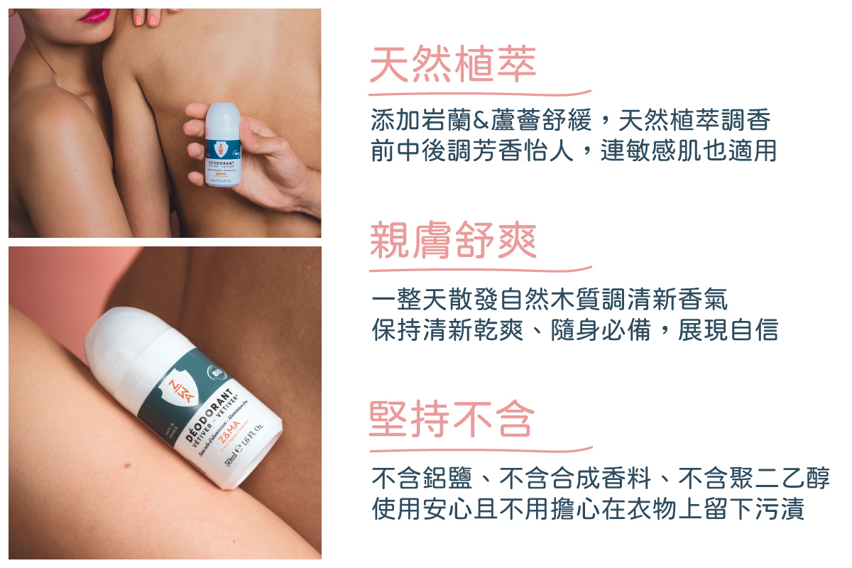天然舒爽肌膚,不含鋁鹽、不含人工香料,親膚清香,掩飾體味,岩蘭木質調的清新香氣可維持整天,緩解肌膚黏膩感,展現自信。