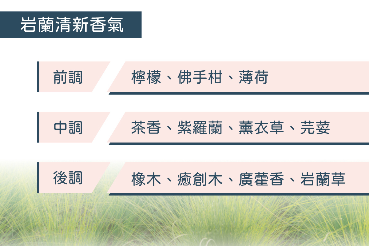 《岩蘭木質調》◆散發自然木質調清新香氣 ◆掩飾肌膚體味,質感淨化 ◆展現自信,夏日加分香氣