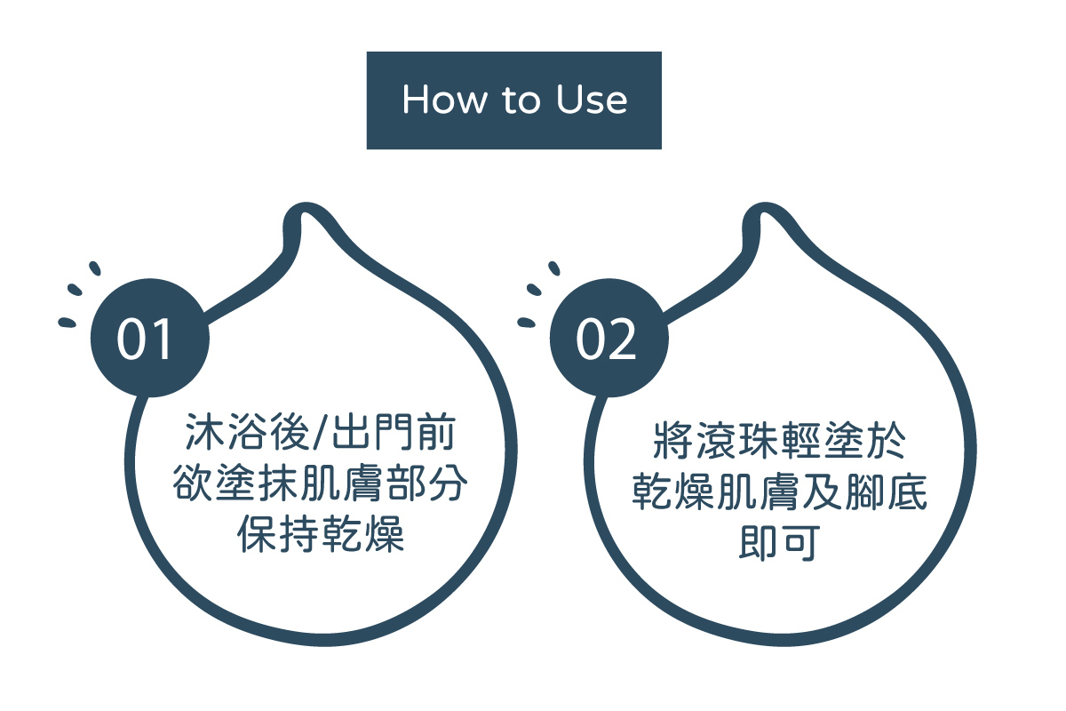 沐浴後/外出前,直接使用滾珠輕塗於乾燥肌膚及腳底,不用擔心在衣襪上留下污漬。
